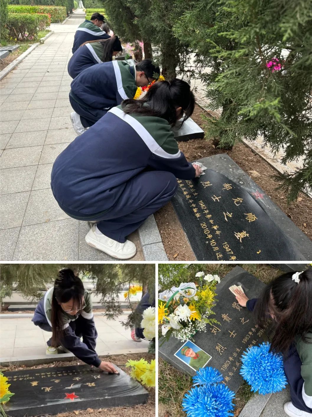 同学们仔细擦洗每一座烈士的墓碑,清理周围的杂草,清扫落叶,以此表达对革命先烈的无限哀思和敬仰之情。